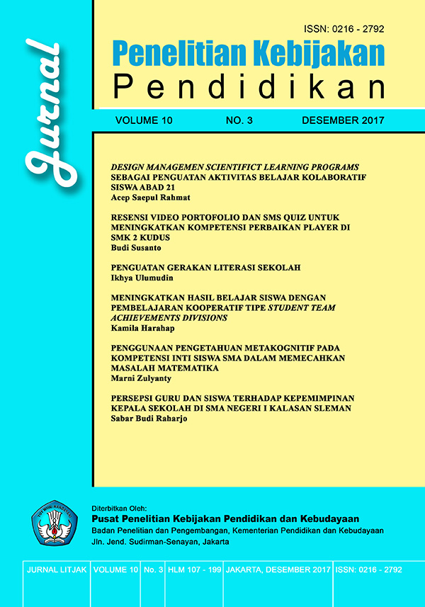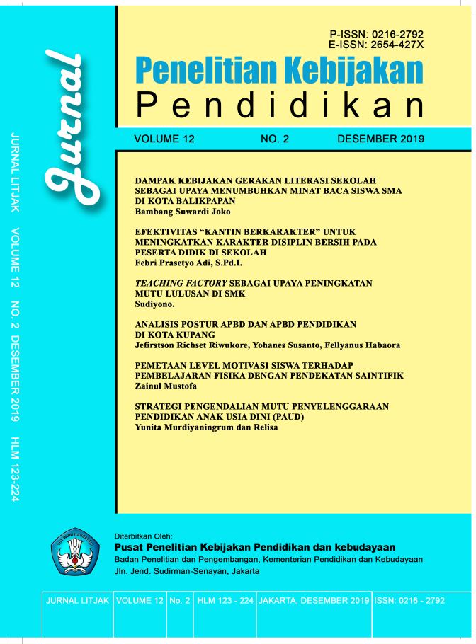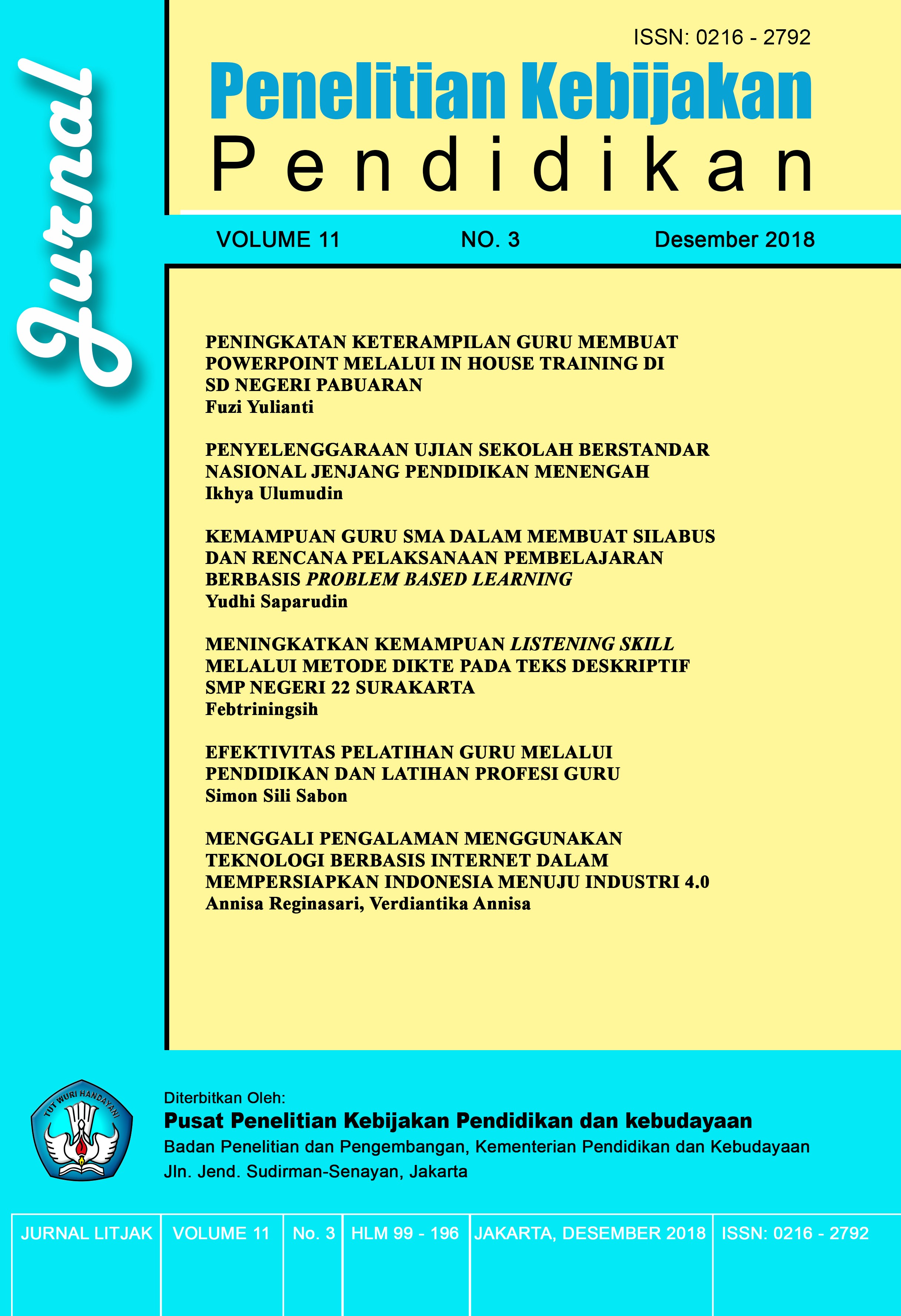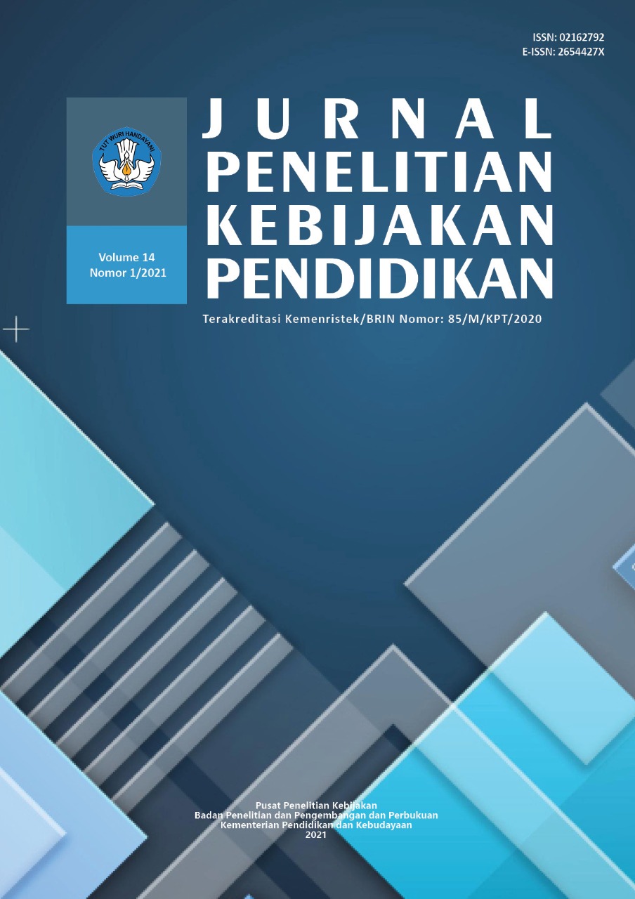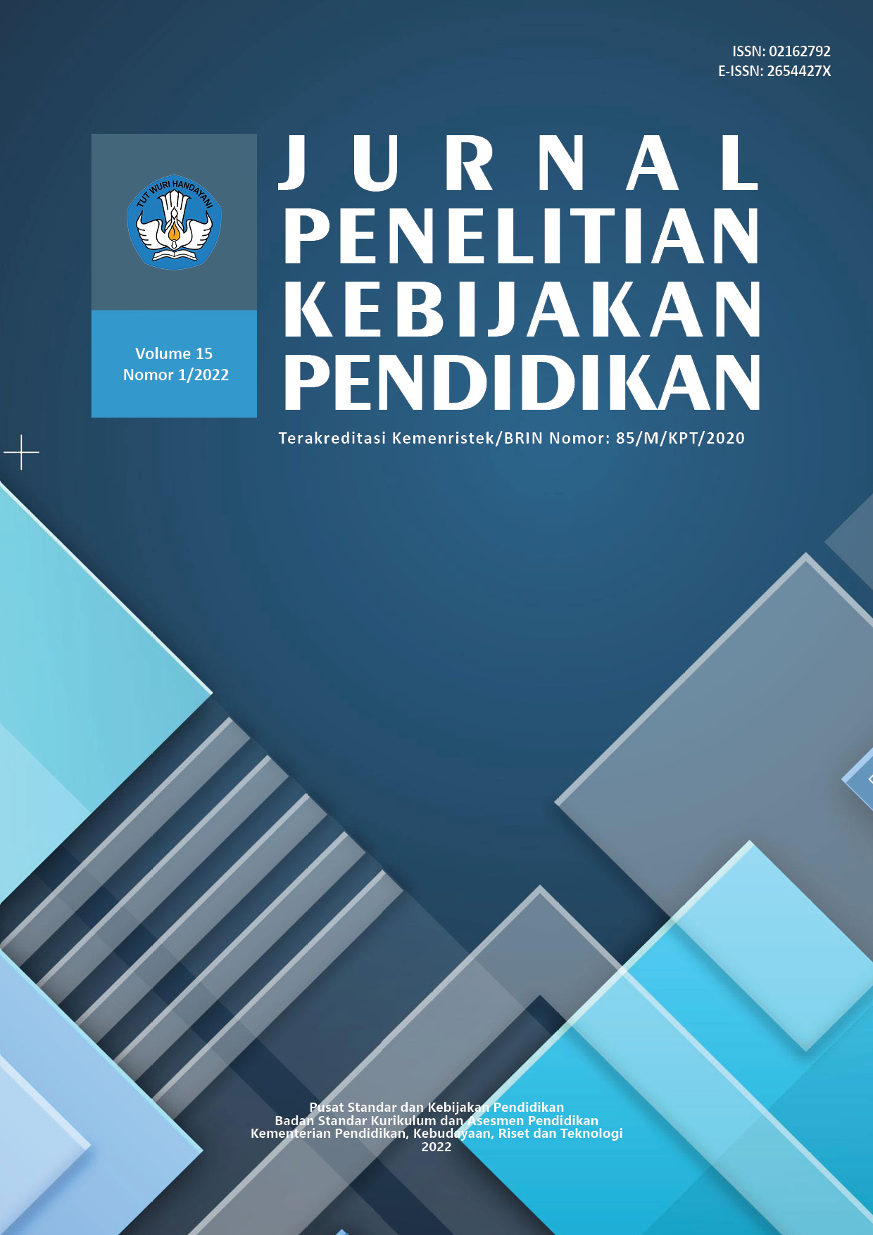 Jurnal Penelitian Kebijakan Pendidikan Volume 15 No. 1 (2022) memuat 6 (enam) artikel dengan tema kebijakan pendidikan. Artikel pertama ditulis oleh Estuti Rochimah, dkk. tentang Keefektifan Kegiatan Kolaboratif Merdeka Belajar Kampus Merdeka (MBKM) pada Skema Mengajar di Satuan Pendidikan. Artikel kedua ditulis oleh Harpiana Rahman, dkk. tentang Pemanfaatan Dongeng Let’s Read sebagai Media Pendidikan Kesehatan Dini di Sekolah Dasar. Artikel ketiga yang ditulis oleh Herman Hendrik memaparkan tentang Peran Organisasi Masyarakat Sipil dalam Pengelolaan Keragaman di Sekolah. Artikel keempat ditulis oleh Parwanto tentang Pengaruh Manajemen Dana, Kualitas Pelayanan Dinas Pendidikan, dan Gaya Kepemimpinan Terhadap Keefektifan Sekolah. Artikel kelima yang ditulis oleh Sudiyono dan Relisa mengkaji tentang Dampak Pandemi Covid-19 terhadap Keterserapan Lulusan SMK ke Dunia Kerja. Artikel terakhir ditulis oleh Dina Rahma Fadlilah dan Yanti Herlanti tentang Implementasi Standar Proses Kurikulum 2013 pada Pembelajaran Biologi SMA/MA Se-Jabodetabek.
